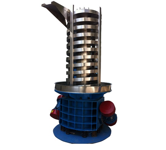 當(dāng)垂直提升機(jī)工作時(shí),根據(jù)雙振動(dòng)電機(jī)自同步原理,由振動(dòng)電機(jī)產(chǎn)生激振力,強(qiáng)迫整個(gè)輸送塔體作水平圓運(yùn)動(dòng)和向上垂直運(yùn)動(dòng)的空間復(fù)合振動(dòng),螺旋槽內(nèi)的物料則受輸送槽的作用,作勻速拋擲圓運(yùn)動(dòng),沿輸送槽體向上運(yùn)動(dòng),從而完成物料的向上(或向下)輸送作業(yè)。